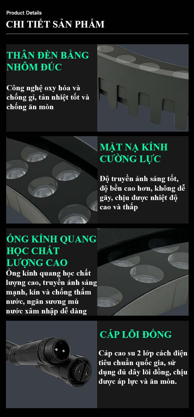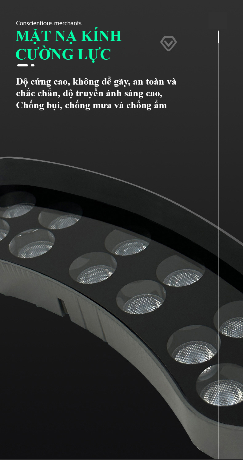 - mặt đèn bằng kính cường lực trong suốt có khả năng chống chịu va đập chống bụi, chống nước xâm nhập vào chip led.