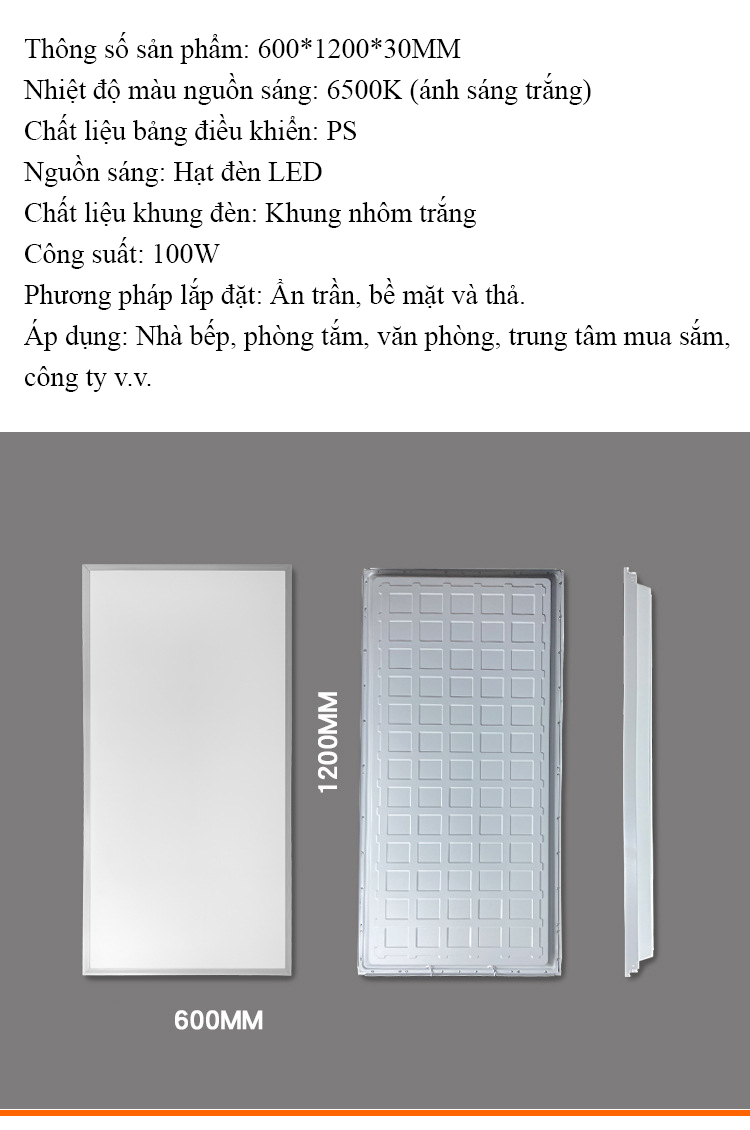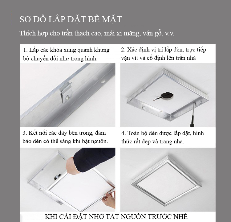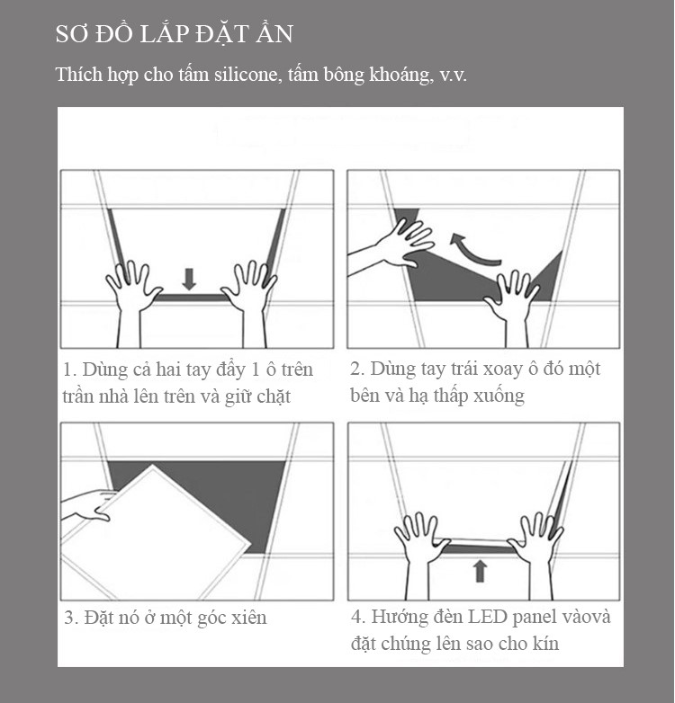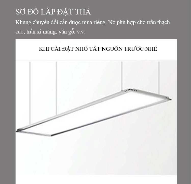 Phương pháp lắp đặt: Ẩm trần, ốp tường và thả.