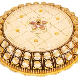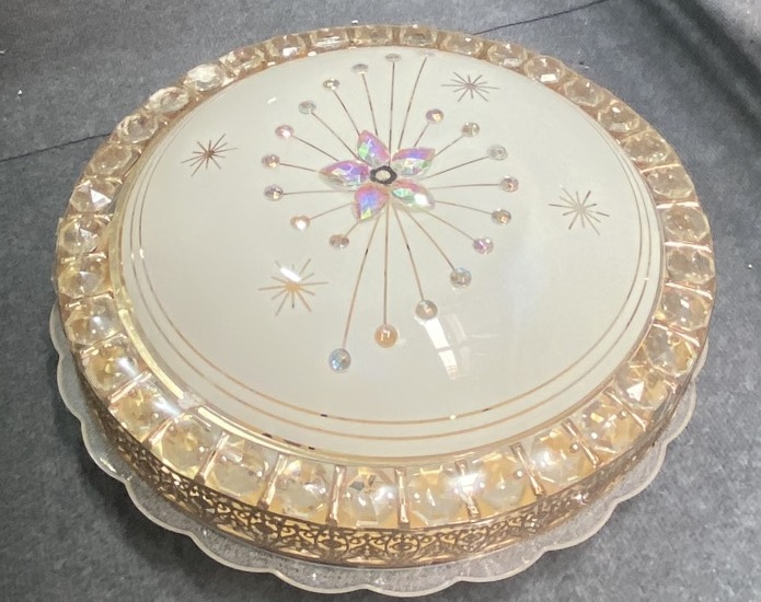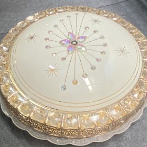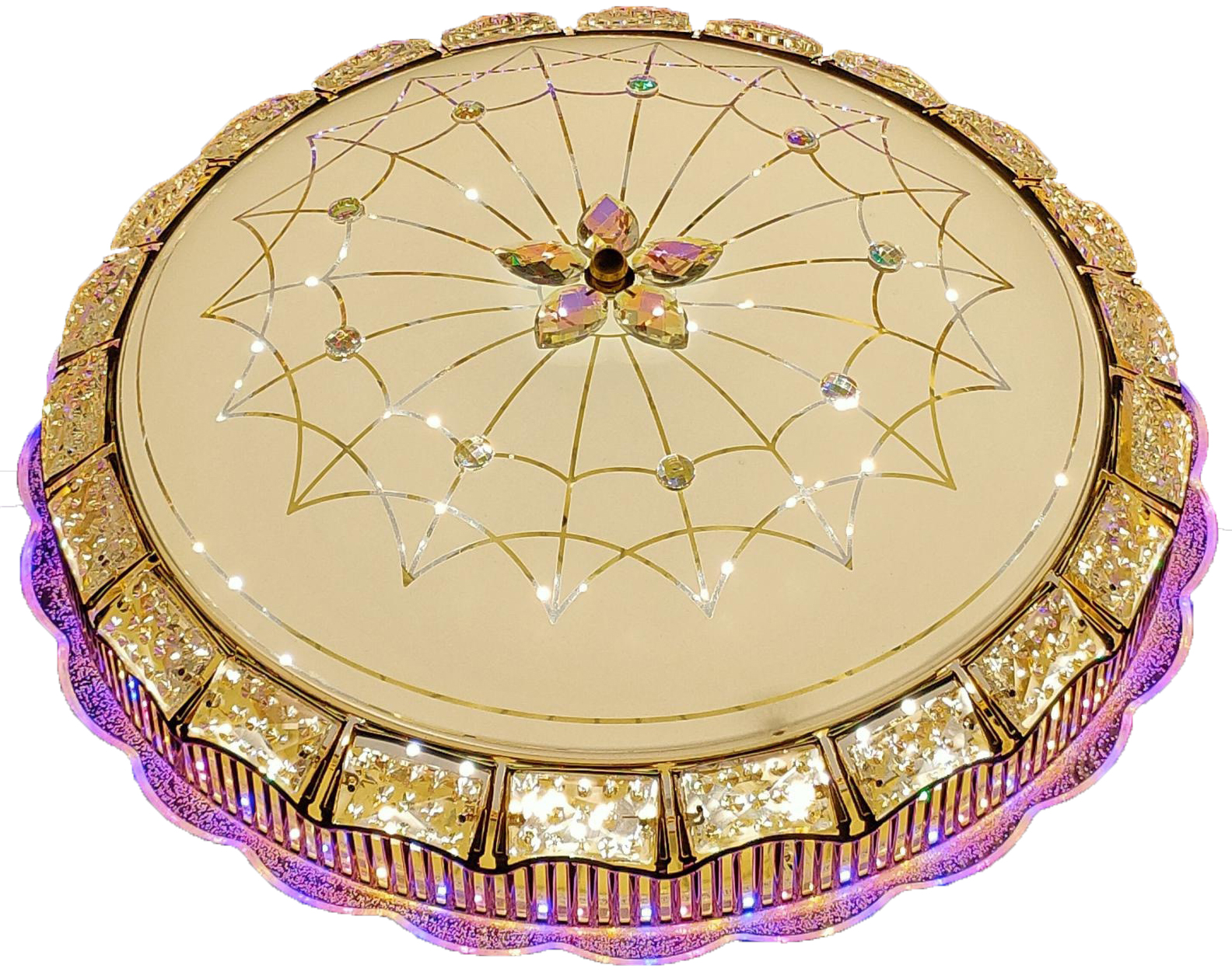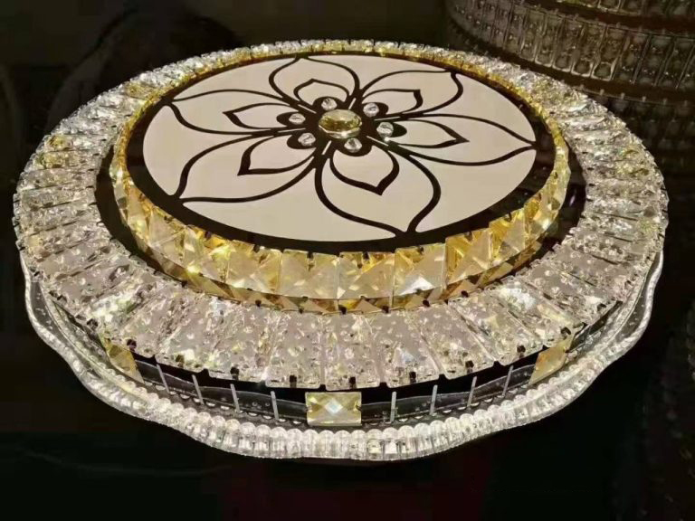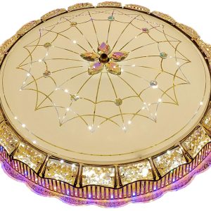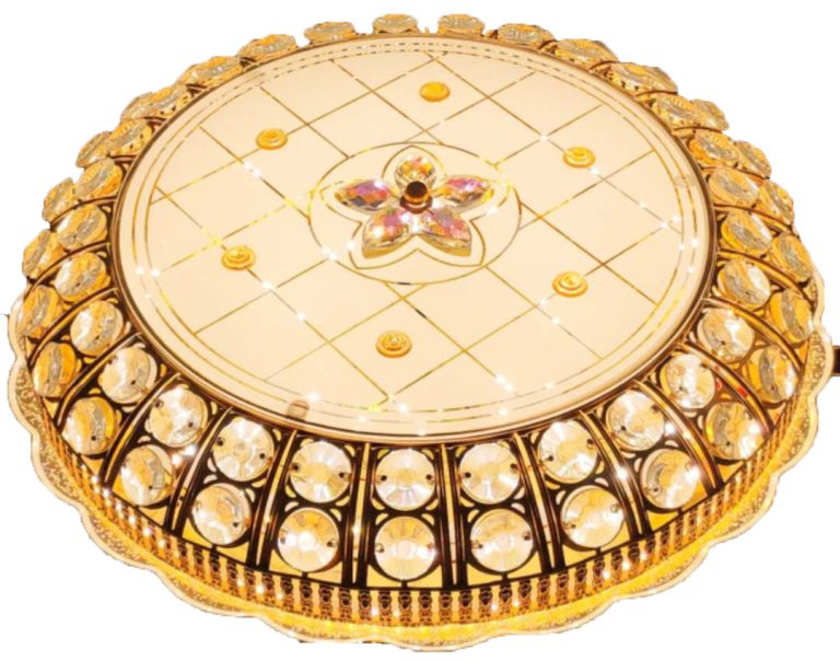 Đèn hình tròn với các chi tiết hoa văn tinh xảo ở giữa. Phần bề mặt của đèn có các họa tiết trang trí nổi bật và nhiều chi tiết lấp lánh.