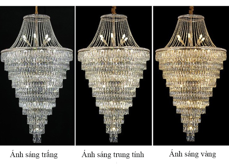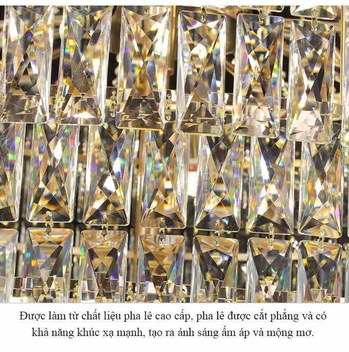 Đèn được cấu tạo từ nhiều lớp pha lê xếp chồng lên nhau, mỗi lớp đều được thiết kế tinh xảo, tạo nên hiệu ứng ánh sáng rực rỡ và bắt mắt.
