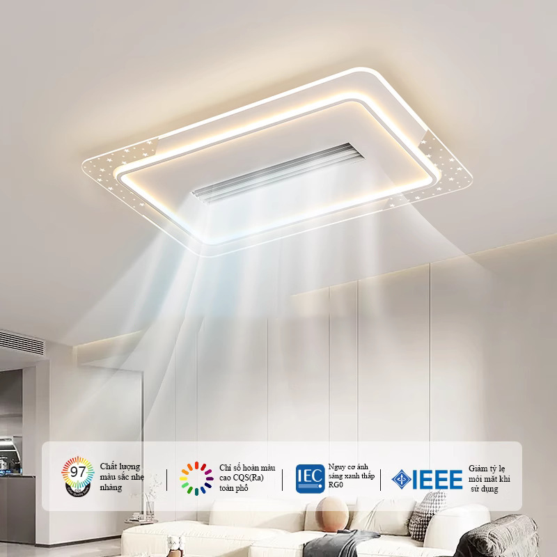Điều khiển thông minh: Nhiều mẫu quạt đèn trần không cánh toàn phổ có thể điều khiển từ xa hoặc qua ứng dụng trên điện thoại, cho phép người dùng dễ dàng điều chỉnh chế độ quạt và ánh sáng theo nhu cầu.